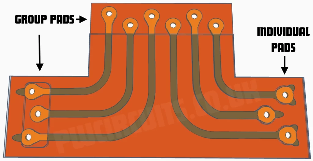 Teardrops are the gradual transition from copper track to copper pad. This feature should be added to both through-hole pads and surface mount pads to reduce stress points and help eliminate breakage during flexing.