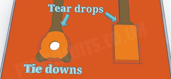 Teardrops are the gradual transition from copper track to copper pad. This feature should be added to both through-hole pads and surface mount pads to reduce stress points and help eliminate breakage during flexing.